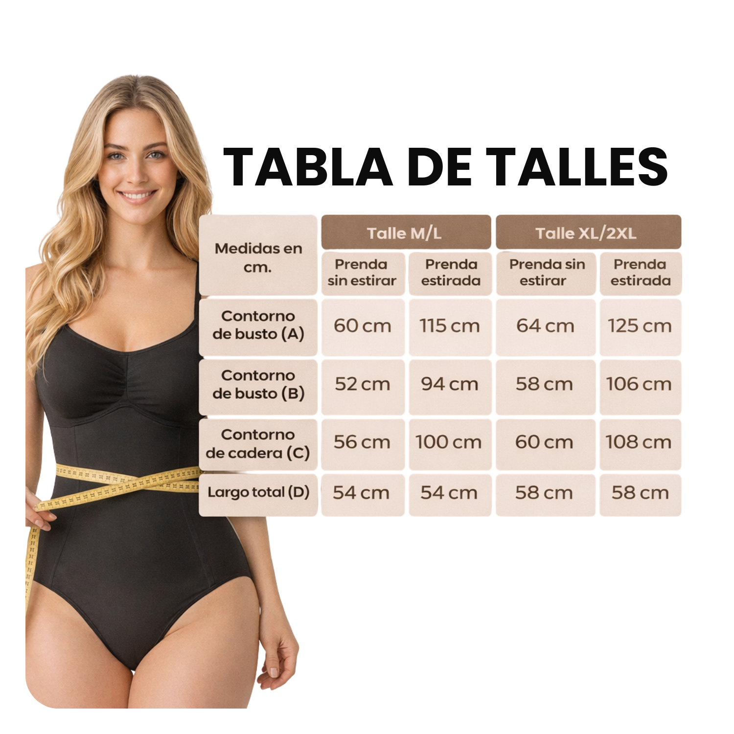 Si estás entre dos talles, recomendamos elegir el más grande para asegurar comodidad y un calce natural. El body tiene elasticidad inteligente que se adapta al cuerpo sin apretar ni marcar.